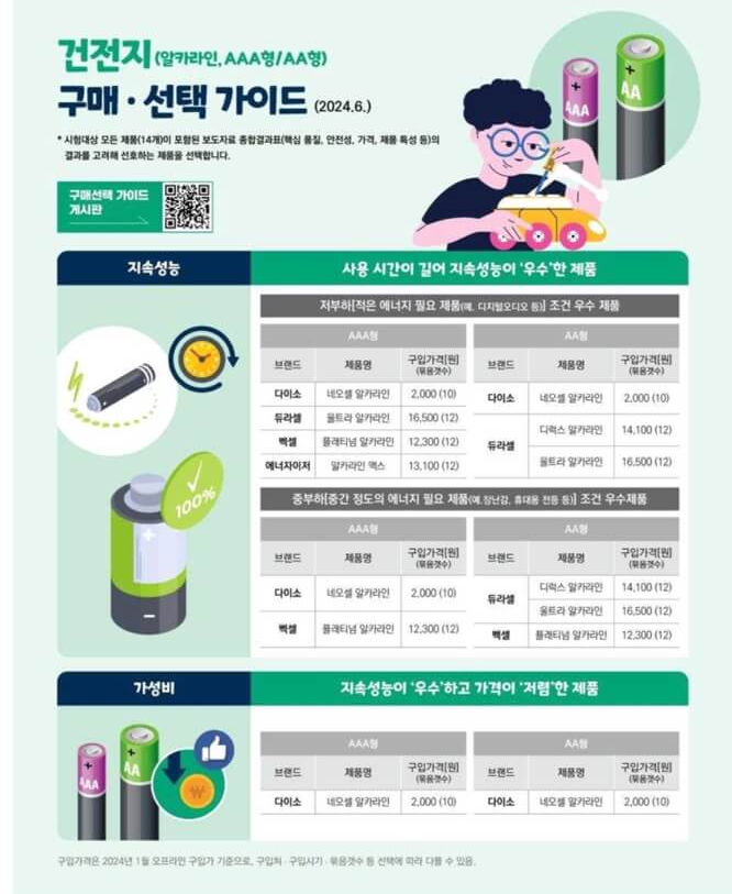 오늘은 가성비 최고의 건전지에 대해 알아보겠습니다. 올해 한국소비자원에서 건전지 종류별로 AA 건전지, AAA 건전지의 성능을 조사한 자료가 있습니다. 한국소비자원 홈페이지 가셔서 배터리 이런 거 검색하지 마시고, 알카라인 건전지라고 검색하시면 자료가 바로 나옵니다. 그거 참고하셔서 좋은 건전지를 선택하시길 바라고, 저는 소비자원 자료가 여러 장이어서 바쁘신 분을 위해 핵심만 줄여 보았습니다. 내돈내산 건전지 리뷰도 함께 적어 보겠습니다.