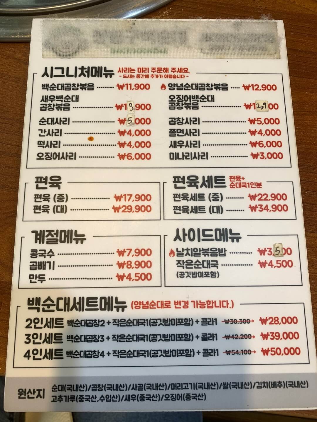 | 4인 세트: 백순대곱창 4 + 작은순대국1(공깃밥 미포함) + 콜라1 | ₩50,000 |