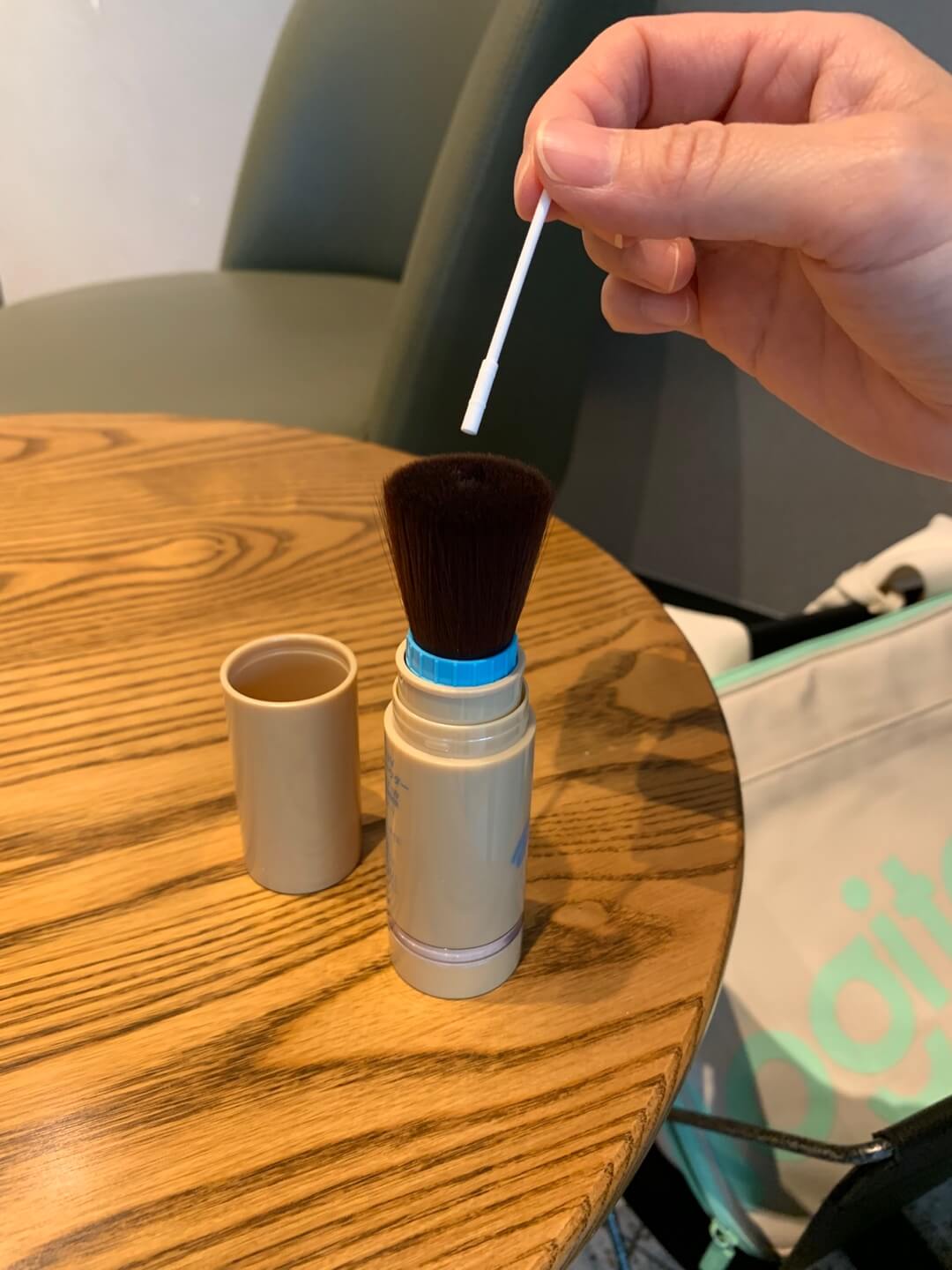 안녕하세요, 오늘은 조금 특이한 메이크업 제품을 소개하려고 해요. 일본 아넷사 사의 선크림 파우더인데요, 정식 명칭은 아네사 퍼펙트 UV 브러시 온 파우더입니다. 브러쉬 제품인데 맨 아래 부분에서 썬파우더가 나와요.